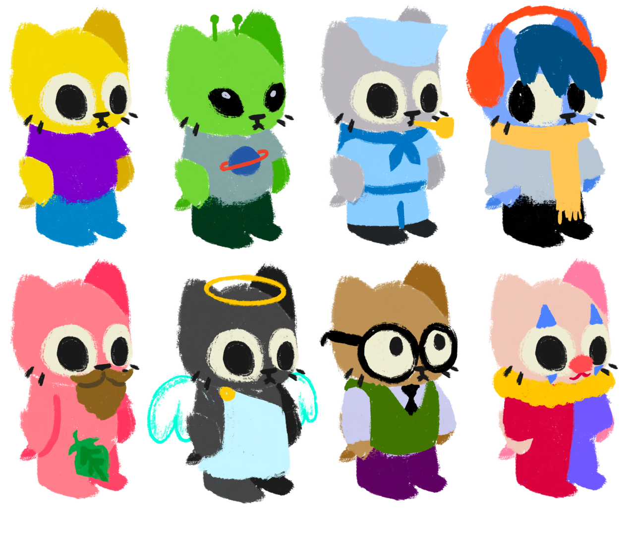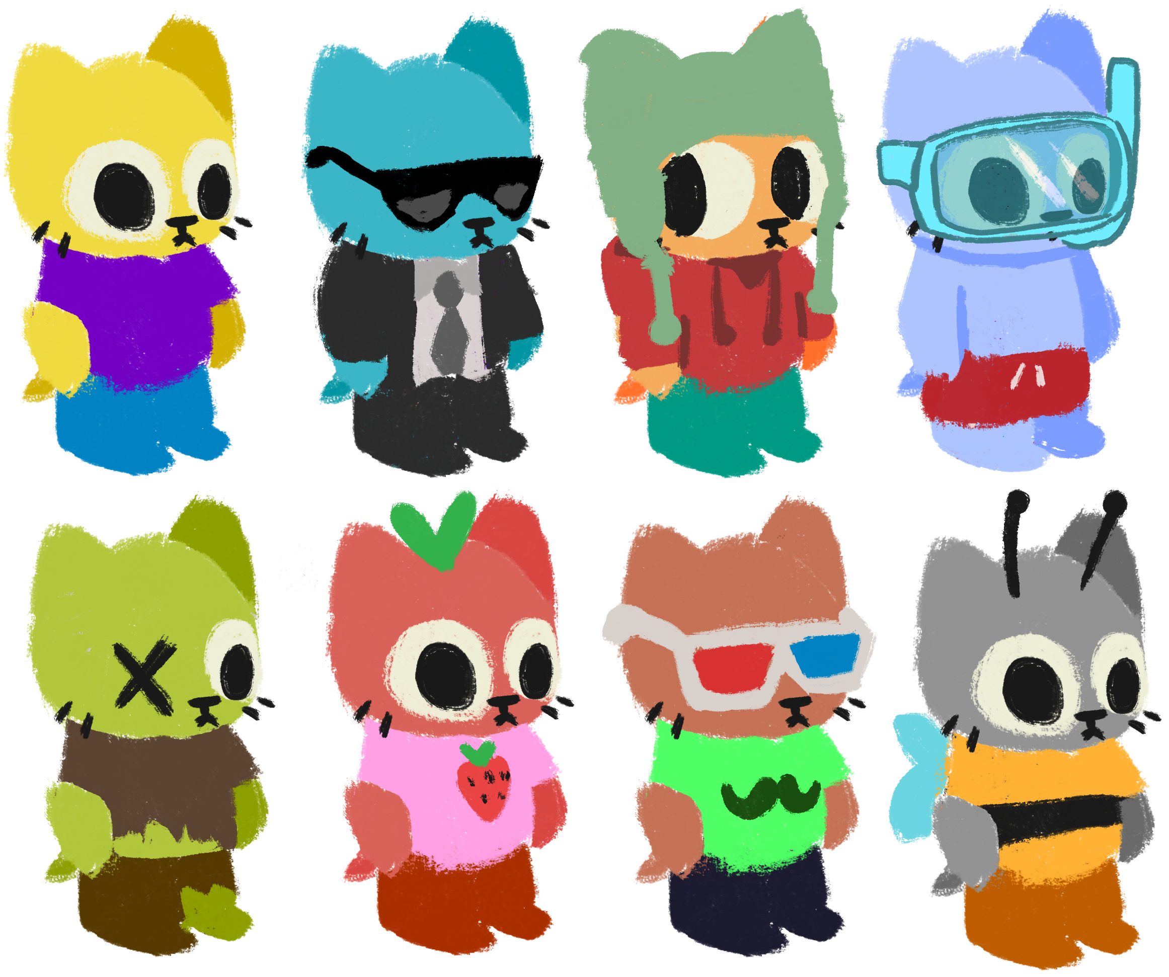 For the character concepts it was integral to keep the designs as simplistic as possible while making sure they all had their own individuality. I was unsure of what each character's personality was going to be like, and so I came up with an array of different costumes inspired by the ones kids were most likely to wear in online worlds.