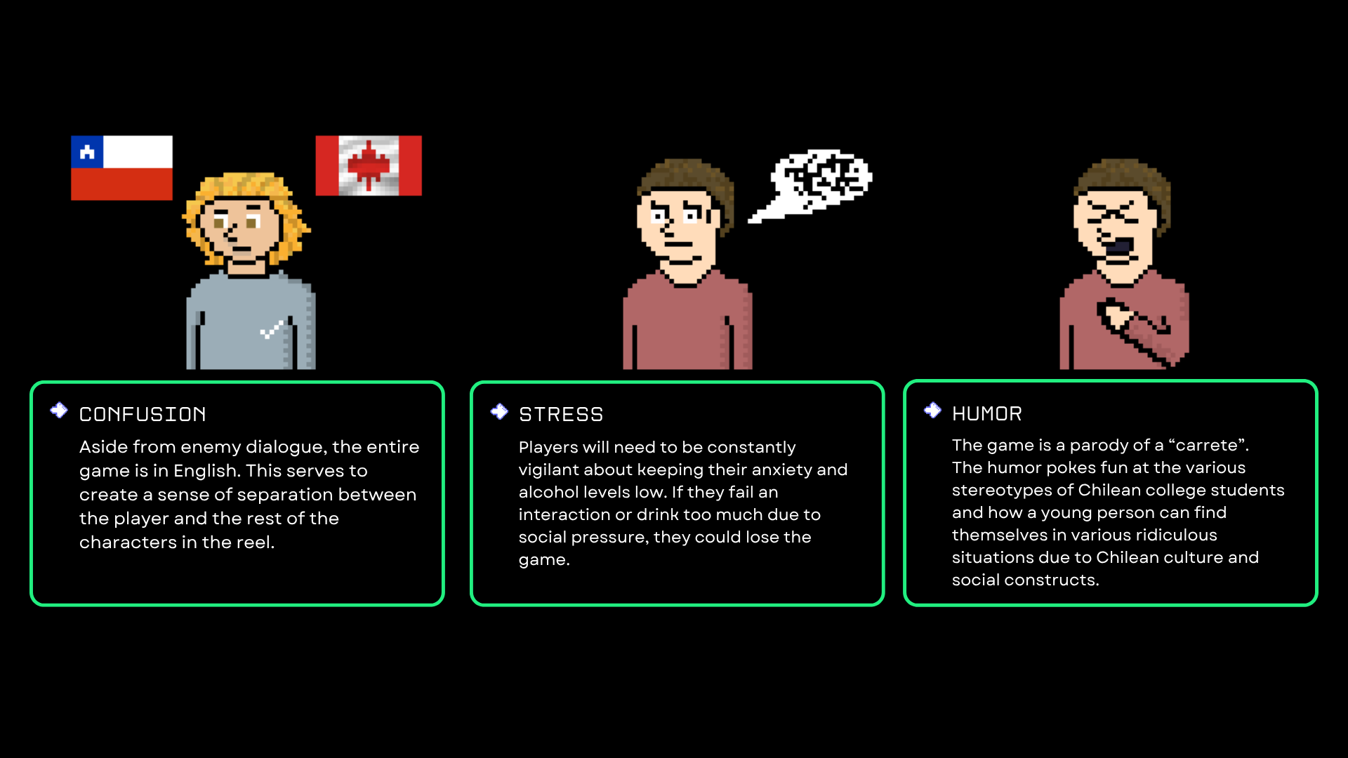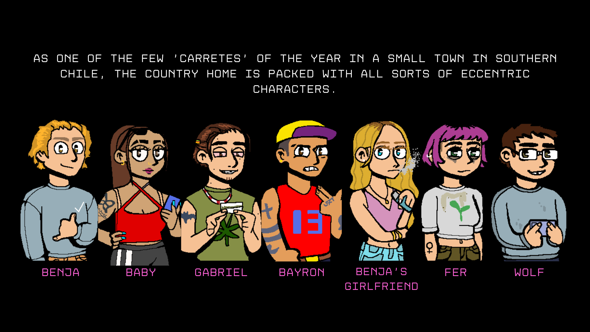 To create the characters, I had to conduct research to understand the types of people who attend 'carretes' (parties). I interviewed 13 individuals: 10 from different regions, 7 women, and 6 men, all between 19-28 years old. They shared their funniest party anecdotes and described the characteristics of the people they knew. Each character in the game represents a Chilean youth stereotype with their respective slang, accents, and behaviours.