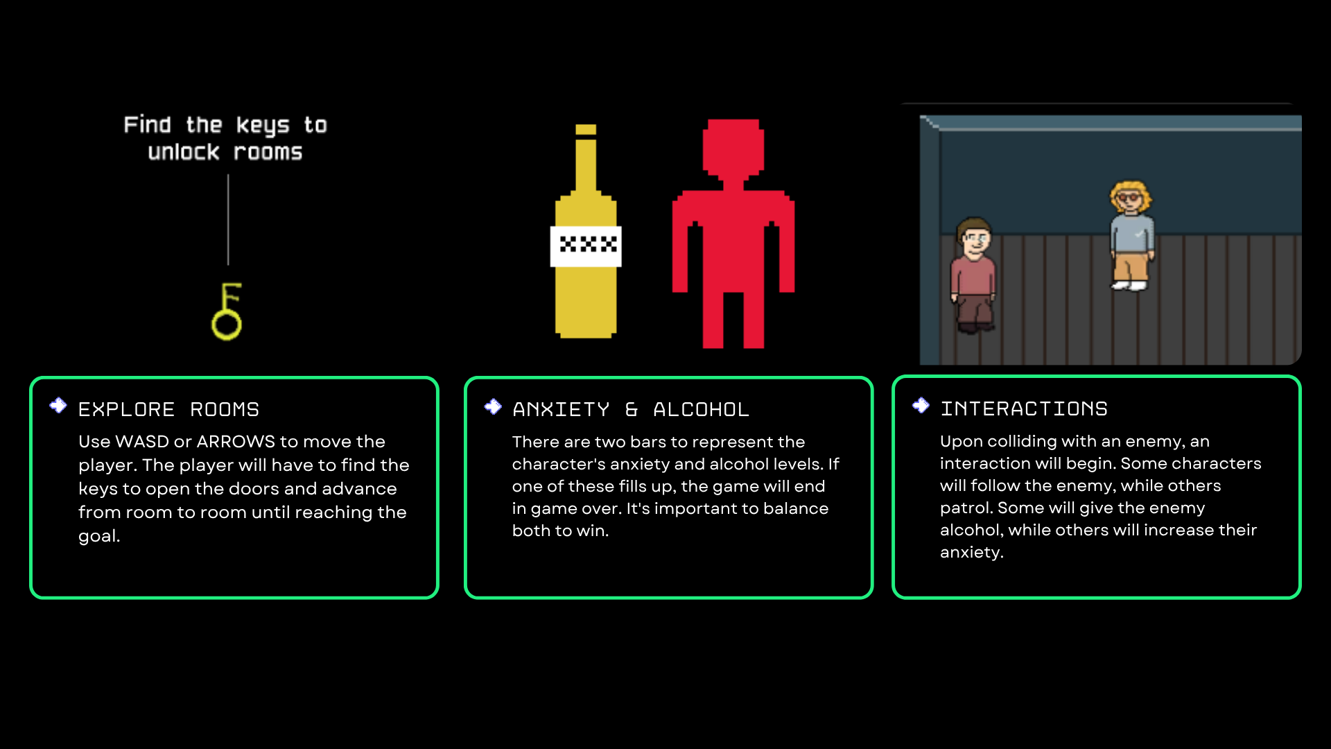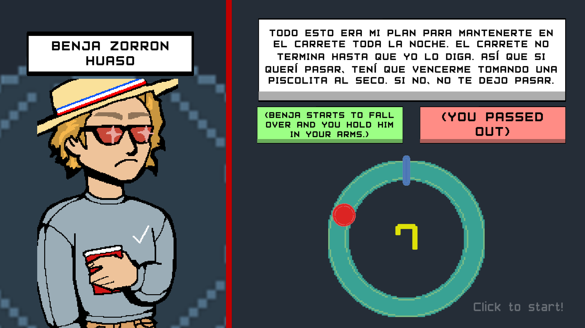 The game features chiptune covers of songs that are popular in Chile, those typically played for diverse groups. However, my music skills at that time weren't what they are now. I had no idea about music theory, and the resulting covers were completely out of sync. Surprisingly, everyone who played the game LOVED the music. Listening to it caused most people to chuckle or to even burst out laughing. It was well-received as the essence of a 'carrete' could still be conveyed even with the chiptune style, and the off-beat notes added more humor to the experience.